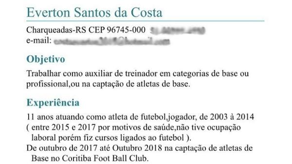 Deixou o clube paranaense em setembro de 2018 e ainda não arrumou outro trabalho depois de seis meses. Na semana passada, postou nas redes sociais o próprio currículo (com telefone, endereço e experiências) para tentar acelerar o processo e sair dessa dificuldade.