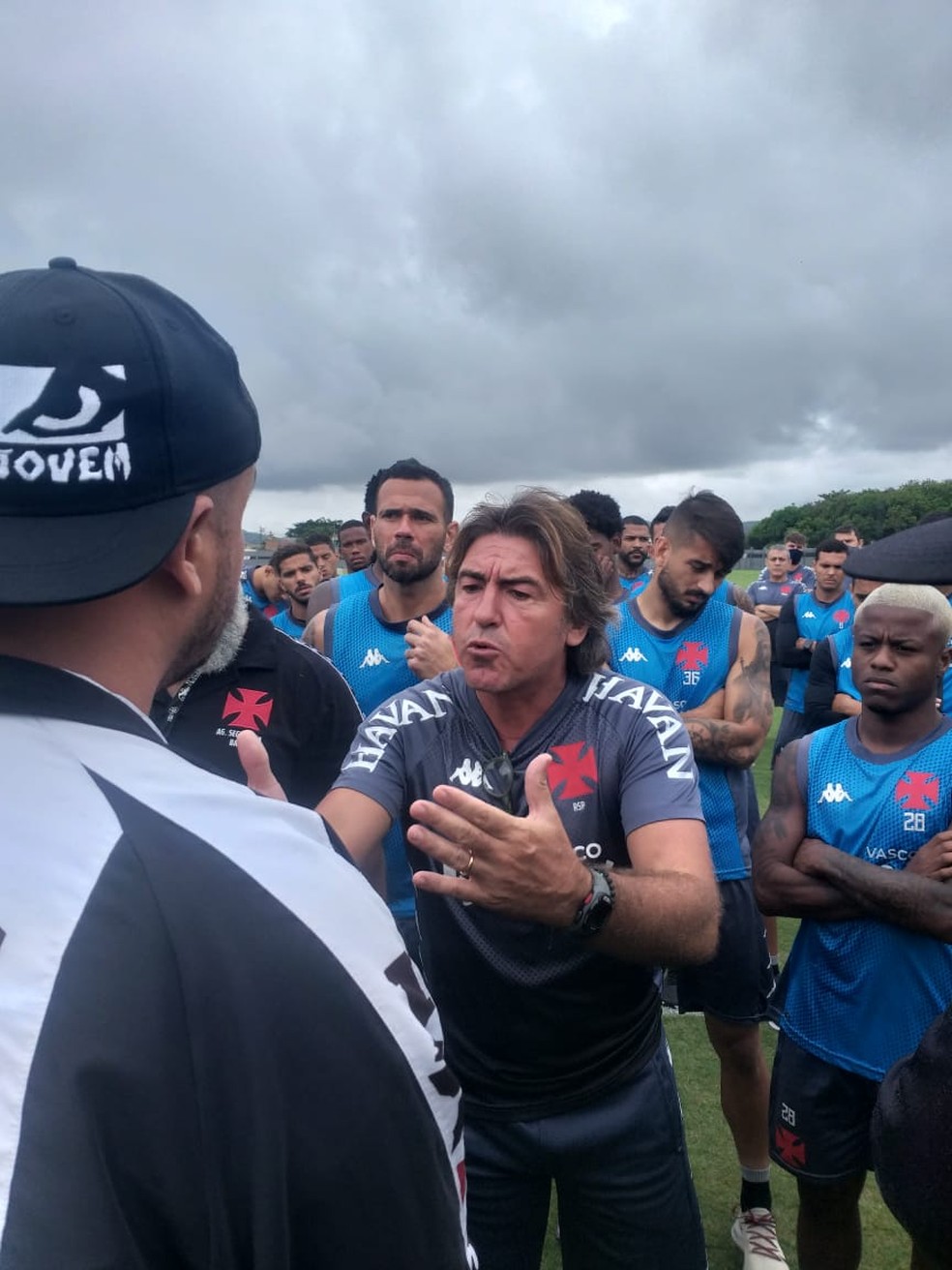 Depois de protestos na semana passada antes do duelo com o Defensa y Justicia, membros de organizadas do Vasco invadiram o CT nesta quinta-feira para cobrar jogadores e o técnico Ricardo Sá Pinto. Em imagem, o português tomou a frente e conversou com os torcedores.