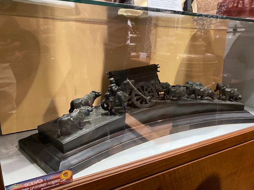 - Aqui, ao meu lado, temos o troféu, que é uma escultura do arquiteto e escultor José Belloni, da Copa do Atlântico de 1947, que foi uma Copa muito especial. Disputaram os melhores equipes de Brasil, Argentina e Uruguai. Por Argentina, representando Boca e River Plate, por Brasil, Palmeiras e Vasco da Gama, e por Uruguai, Peñarol e Nacional.