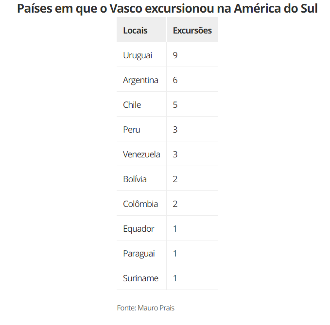 Desde sua fundação, o Vasco tem uma história rica em excursões pelo mundo, para a disputa de torneios amistosos ou oficiais. De acordo com um levantamento do historiador Mauro Prais, o Uruguai, país onde o clube faz pré-temporada no momento, é o local que mais recebeu excursões vascaínas na América do Sul - inclusive, a primeira no continente, justamente em 1947, na Copa Atlântico.