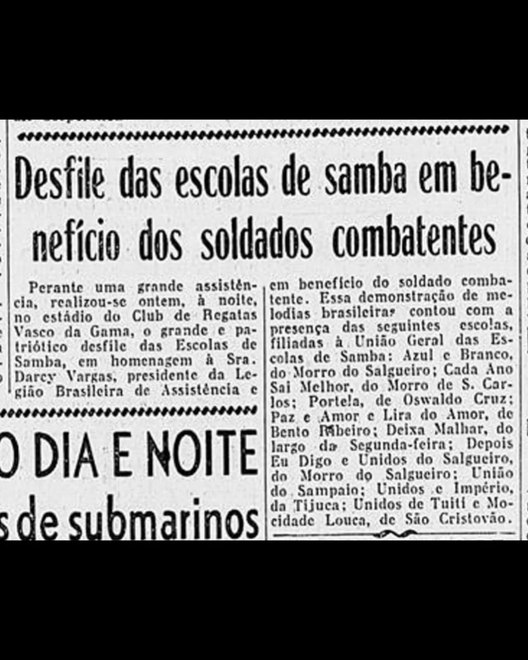 No dia 24/01/1943, os sambistas aceitaram a convocação da primeira-dama do país, Darcy Vargas, e realizaram um desfile não-competitivo em benefício da cantina do soldado, cujos fundos arrecadados seriam destinados às vítimas dos navios brasileiros afundados pelos alemães.