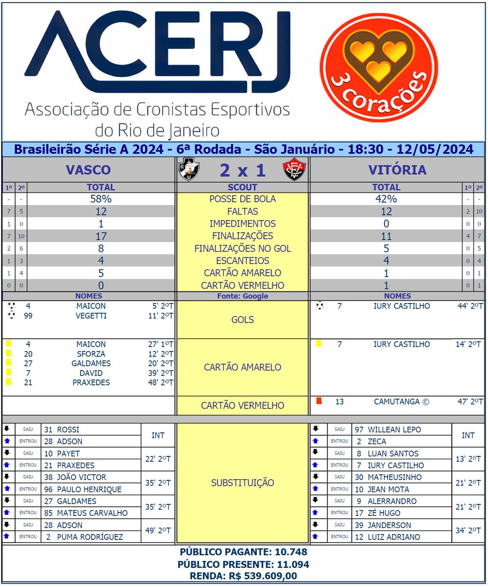 Scout Final de Vasco e Vitória pela 6ª Rodada do Campeonato Brasileiro 2024 em São Januário (Fonte: Google) #Acerjinforma #brasileirao2024 #VASxVIT #Vasco #ECVitoria @Brasileirao @VascodaGama @ECVitoria