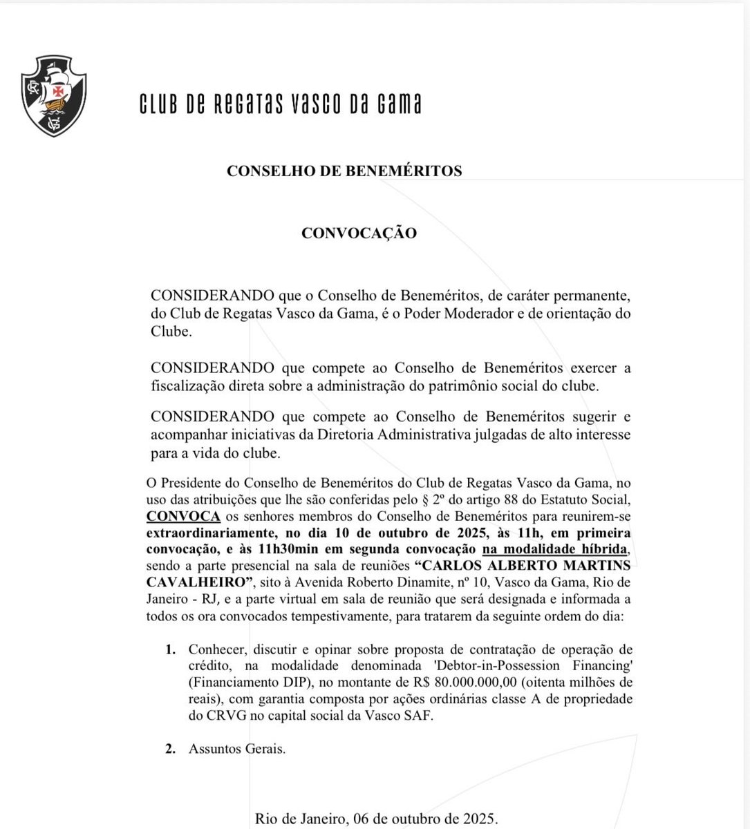 O Conselho de Beneméritos foi convocado para conhecer e opinar sobre a proposta de contratação do DIP
