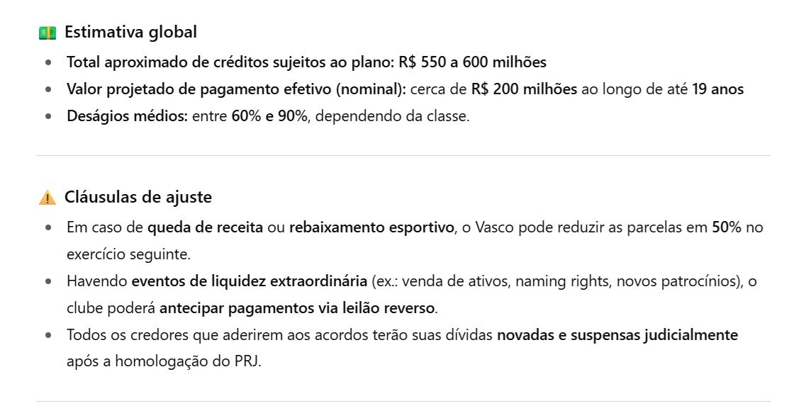 ⚙️ O Vasco poderá ajustar parcelas em até 50% em caso de queda de receitas ou rebaixamento, mas também poderá antecipar pagamentos se houver novas receitas — como vendas de ativos, naming rights ou grandes patrocínios.