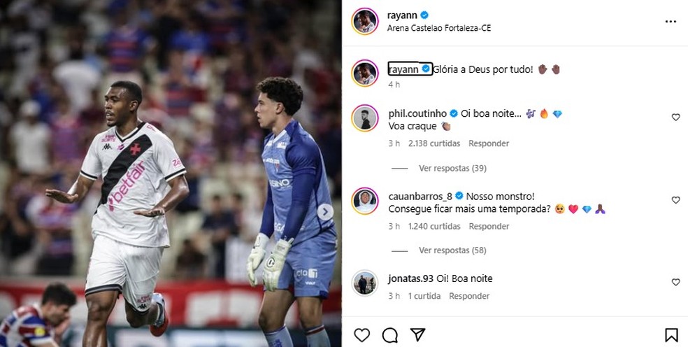 Além de talismã da equipe, Barros também é um dos melhores amigos de Rayan no elenco do Vasco. Os dois jogadores atuaram por muito tempo juntos na base do clube. Em uma publicação do atacante nesta quinta-feira, o volante comentou pedindo a permanência do jogador — alvo de clubes da Europa — por mais uma temporada.
