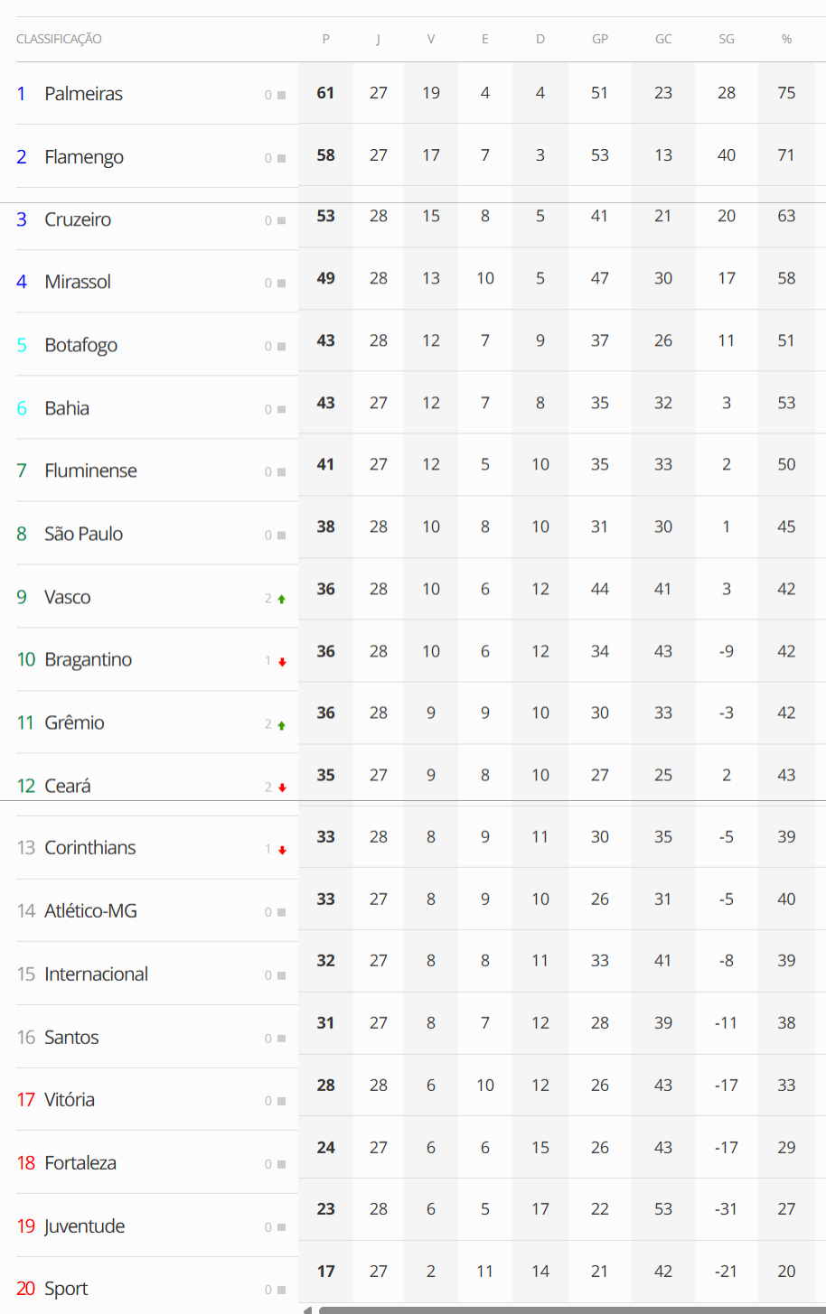 Terminada a 28ª rodada do Campeonato Brasileiro, o Vasco, que venceu o Fortaleza por 2 a 0, está na 9ª colocação.