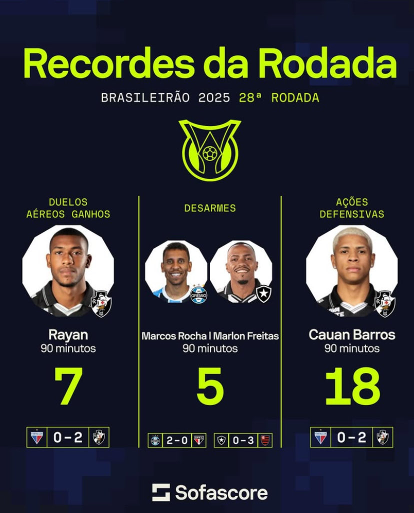 💢👀 Rayan foi o recordista da rodada em duelos aéreos ganhos, e Cauan Barros e Léo Jardim destaques no setor defensivo.