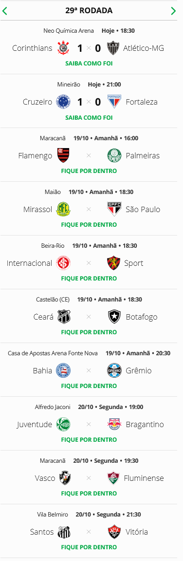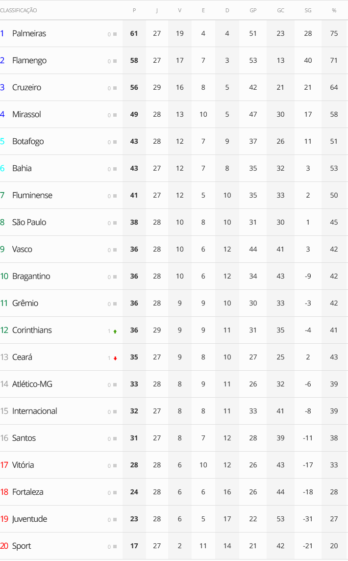 Dois jogos abriram a 29ª rodada do Campeonato Brasileiro neste sábado. O Vasco, que enfrenta o Fluminense na segunda-feira no Maracanã, está em 9º lugar.