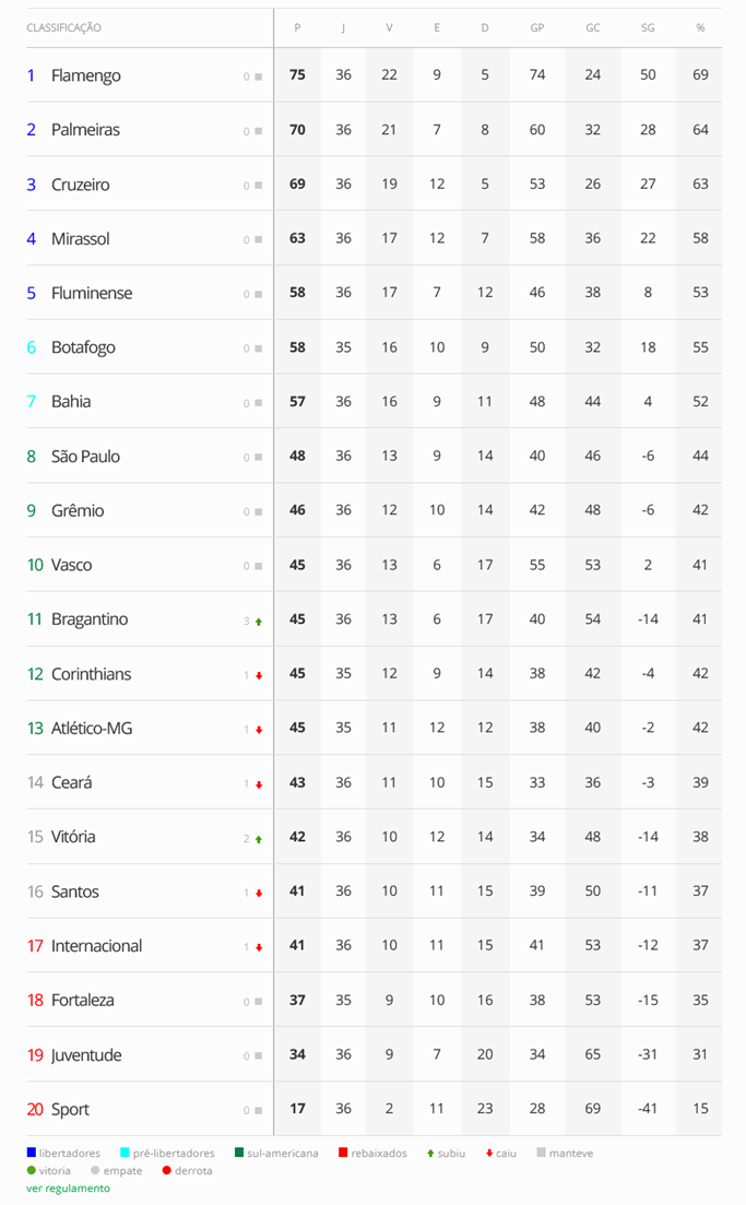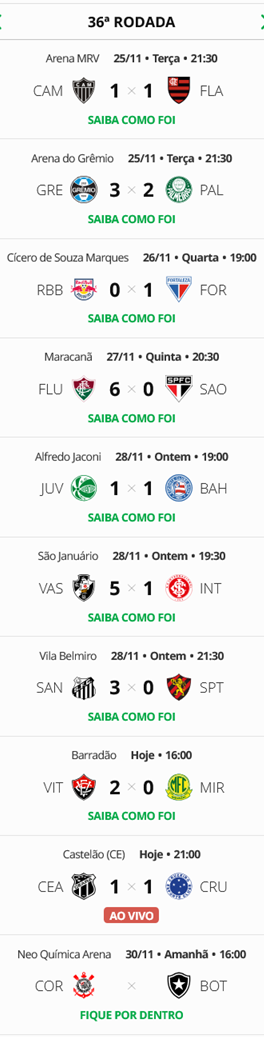 O Ceará empatou com o Cruzeiro por 1 a 1 e ficou 2 pontos atrás do Vasco, que está na 10ª colocação no Brasileiro. A 36ª e penúltima rodada termina neste domingo com o jogo Corinthians x Botafogo. O domingo também terá um jogo atrasado da 35ª rodada: Fortaleza x Atlético-MG.