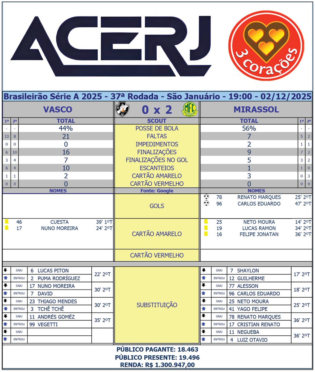 VASCO PERDE PARA O MIRASSOL EM SÃO JANUÁRIO: 2 A 0