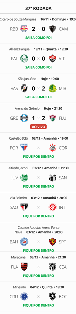 Terminados os jogos de 3ª-feira da 37ª e penúltima rodada do Campeonato Brasileiro, o Vasco, que perdeu para o Mirassol por 2 a 0, se manteve na 11ª colocação. O Gigante da Colina ainda tem remotas chances de ser rebaixado, assim como de terminar no G8 e conquistar uma vaga na Libertadores.