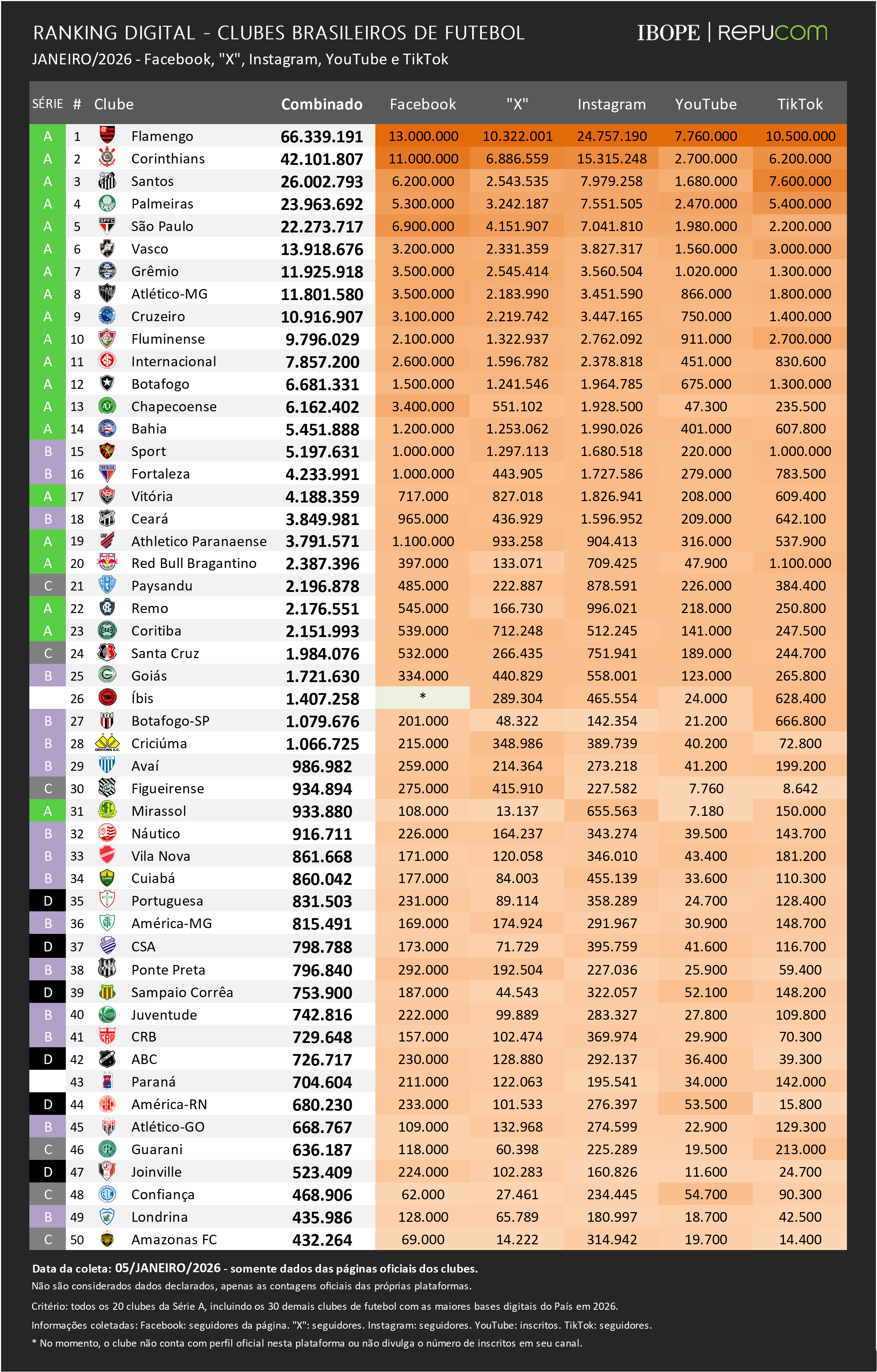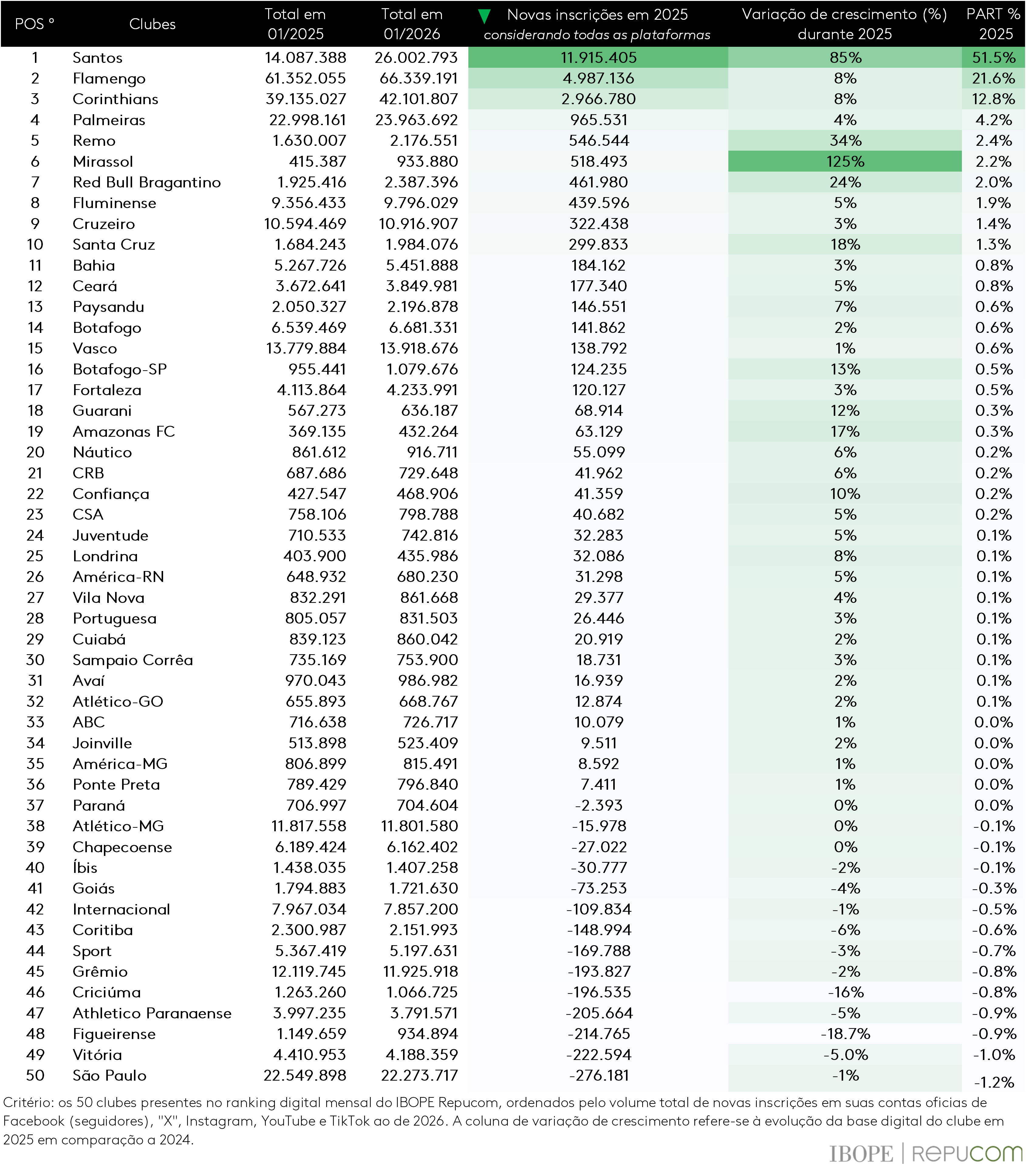 Na primeira edição do Ranking Digital dos Clubes Brasileiros de 2026, o IBOPE Repucom destaca o desempenho anual na busca por novos inscritos nas redes sociais dos 50 clubes monitorados durante o ano de 2025. No acumulado de 2025, os cinco clubes que mais evoluíram em suas bases digitais foram: Santos (11,9 milhões de inscrições), Flamengo (4,9 milhões), Corinthians (2,9 milhões), Palmeiras (965 mil) e Remo (546 mil).