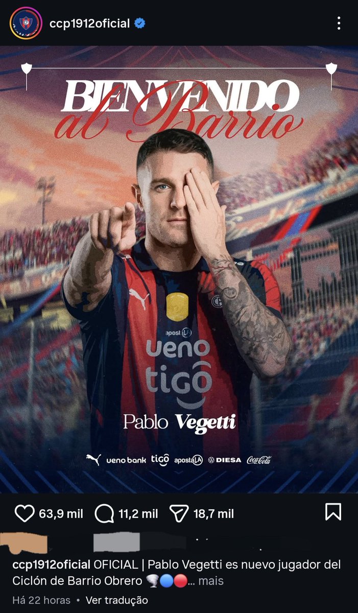O Vegetti, até esse momento, não curtiu, não comentou, nem republicou a postagem do Cerro Porteño.