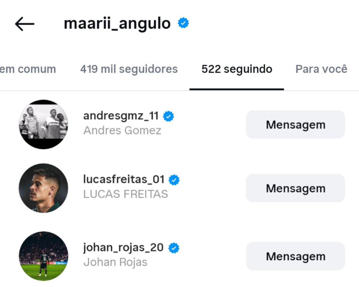 Hinestroza está seguindo os vascaínos Andrés Goméz, Lucas Freitas e Johan Rojas no Instagram
