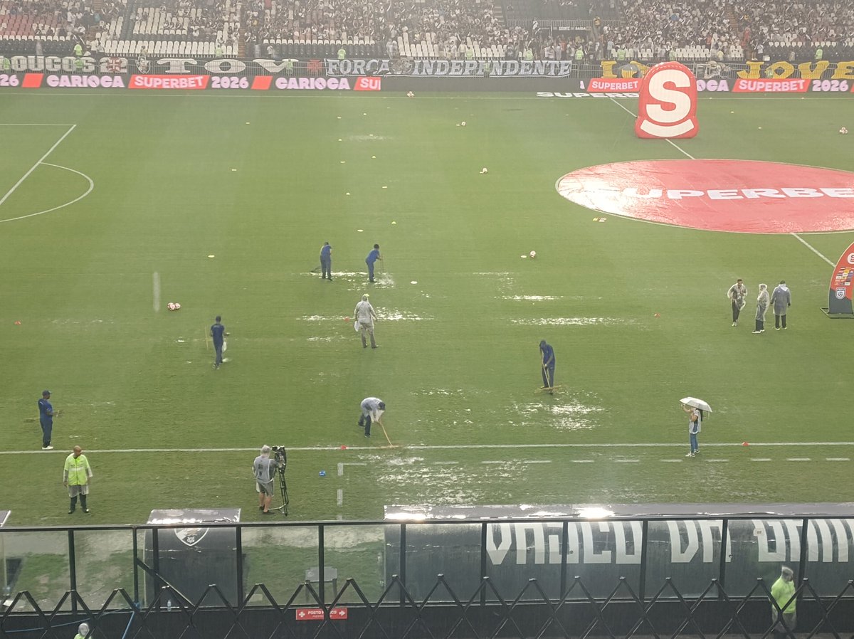 Por causa da forte chuva, funcionários do Vasco estão com rodos tirando o excesso de água dentro do gramado. A partida será adiada em 15 minutos e terá início às 18h15.