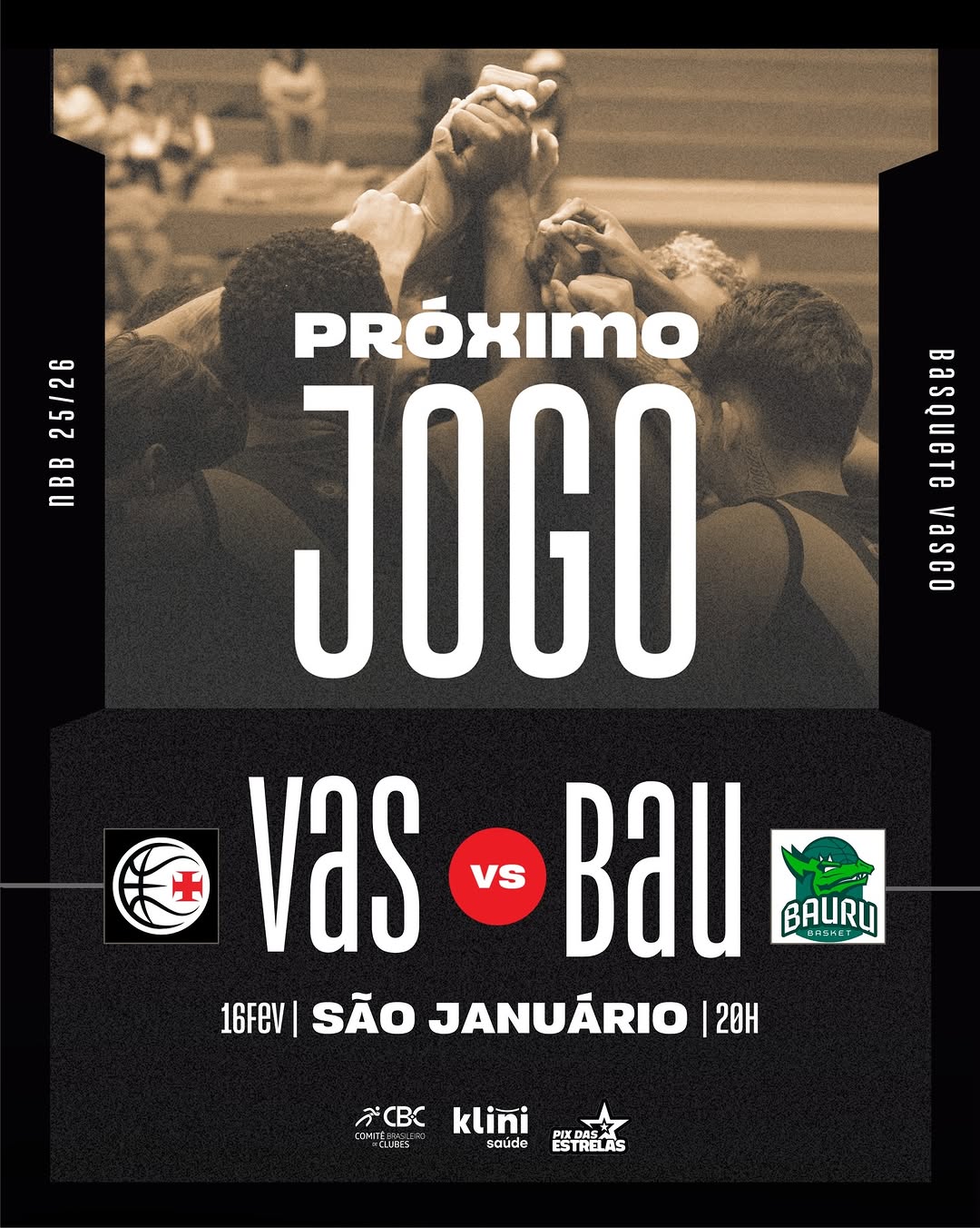 AMANHÃ é dia de São Januário. 💢🏀 O Vasco da Gama volta à quadra às 20h para enfrentar o Bauru, em casa, por mais um desafio no NBB Caixa 25/26.