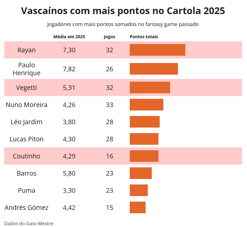 Somado, o trio que se despediu do Vasco passou dos 500 pontos no Cartola passado. Rayan foi o vascaíno que mais pontuou naquela edição (233 pontos), Vegetti esteve próximo dos 170, e Coutinho ficou nos 120. Entre os maiores pontuadores, ficaram Paulo Henrique (203 pontos), Nuno Moreira (140), Léo Jardim (125) e Lucas Piton (120).