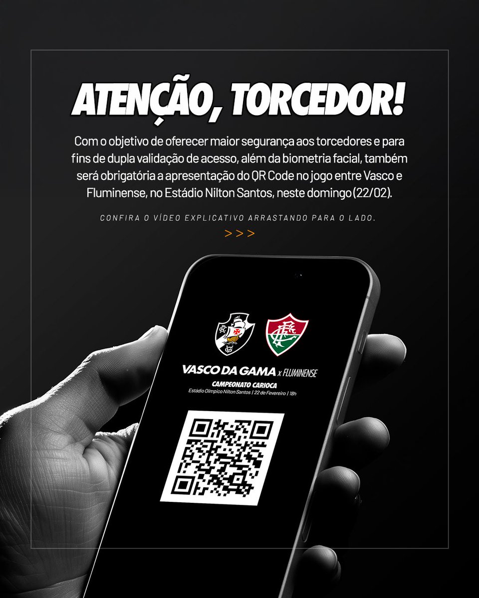 Com o objetivo de oferecer maior segurança aos torcedores e para fins de dupla validação de acesso, além da biometria facial, também será obrigatória a apresentação do QR Code no jogo entre Vasco e Fluminense, no Estádio Nilton Santos, neste domingo (22/02).