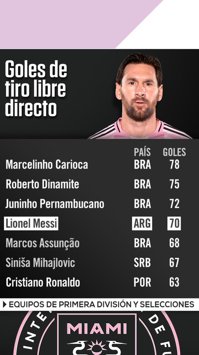 Con su OBRA DE ARTE para sellar su doblete en el Clásico ante Orlando City, Leo Messi llegó a los 70 goles de tiro libre en su carrera. Tan solo 3 jugadores tienen más que él: Juninho Pernambucano, Roberto Dinamite y Marcelinho Carioca... ¿Podrá superarlos?