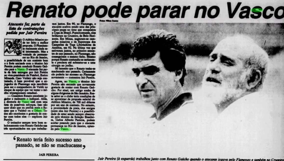 Uma curiosidade sobre Renato Gaúcho e o Vasco: em 1994, o então atacante quase foi parar em São Januário. Jair Pereira, técnico do clube, pediu a sua contratação - haviam trabalhado no Flamengo e no Cruzeiro.