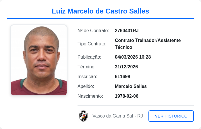 Tipo de contrato: Contrato Treinador/Assistente Técnico