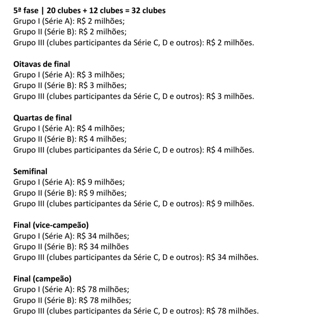 Esses são os valores de premiação pro avanço de cada fase da Copa do Brasil 2026. O Vasco entra apenas na 5a fase. Por participar, ganhará R$ 2 milhões. Se passar às oitavas, receberá 3 mi. Quartas: 4 mi. Semi: 9 mi. Na final, o vice ganha 34 mi e o campeão 78 mi.