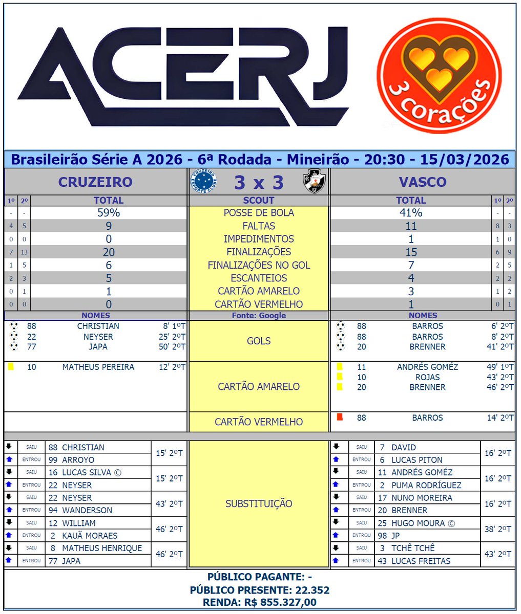 Em um jogo absolutamente insano no Mineirão, em que não faltaram personagens, Cruzeiro e Vasco acabaram empatando: três gols para cada lado e uma pitada de frustração de parte a parte pelo roteiro para lá de imprevisível.