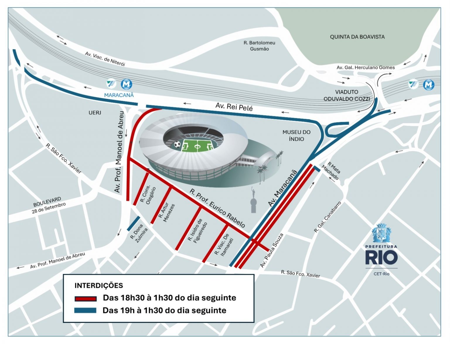 A Companhia de Engenharia de Tráfego do Rio de Janeiro (CET-Rio) implantará uma operação de trânsito nesta quarta-feira (18/03) para o jogo entre Vasco e Fluminense pelo Campeonato Brasileiro, que acontecerá às 21h30, no estádio do Maracanã. As interdições ao trânsito de veículos na região começam a partir das 18h30 e vão até 1h30 de quinta-feira (19/03). Além dos locais regulamentados com proibição de estacionamento, outras vias também estarão restritas ao estacionamento a partir das 10h.