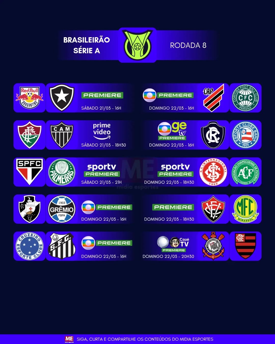 Confira a agenda de transmissões da 8ª rodada da Série A do Campeonato Brasileiro. Destaque para a Globo, que transmite 4 jogos da Série A e 1 da Série B, com as praças bem divididas.