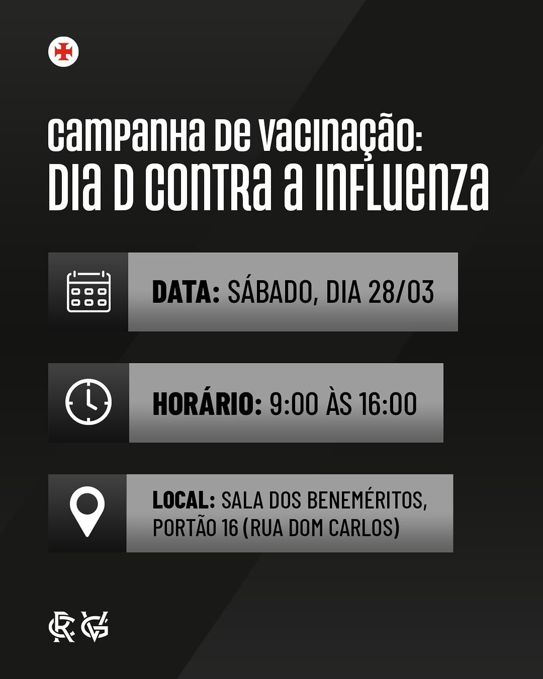 Neste sábado (28/03), o Vasco recebe a campanha "Dia D Contra a Influenza", em parceria com o Centro Municipal de Saúde Zeferino Tibau Junior.