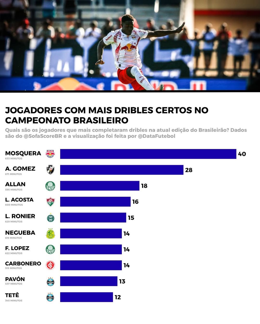 Henry Mosquera, do Red Bull Bragantino, lidera com 40 DRIBLES (!).