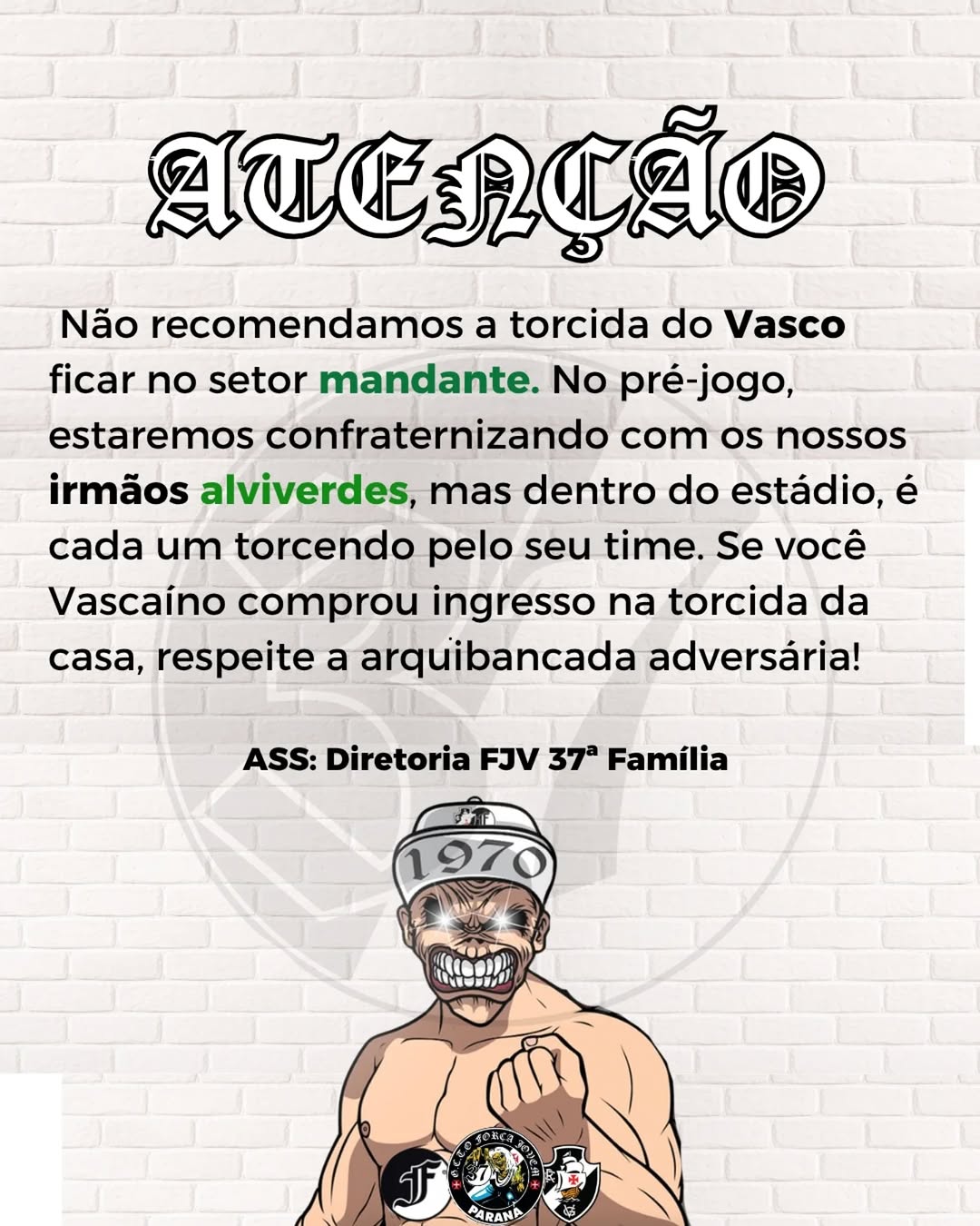 FJV 37ª Família Paraná recomenda que vascaínos não fiquem no setor da torcida mandante em Coritiba x Vasco