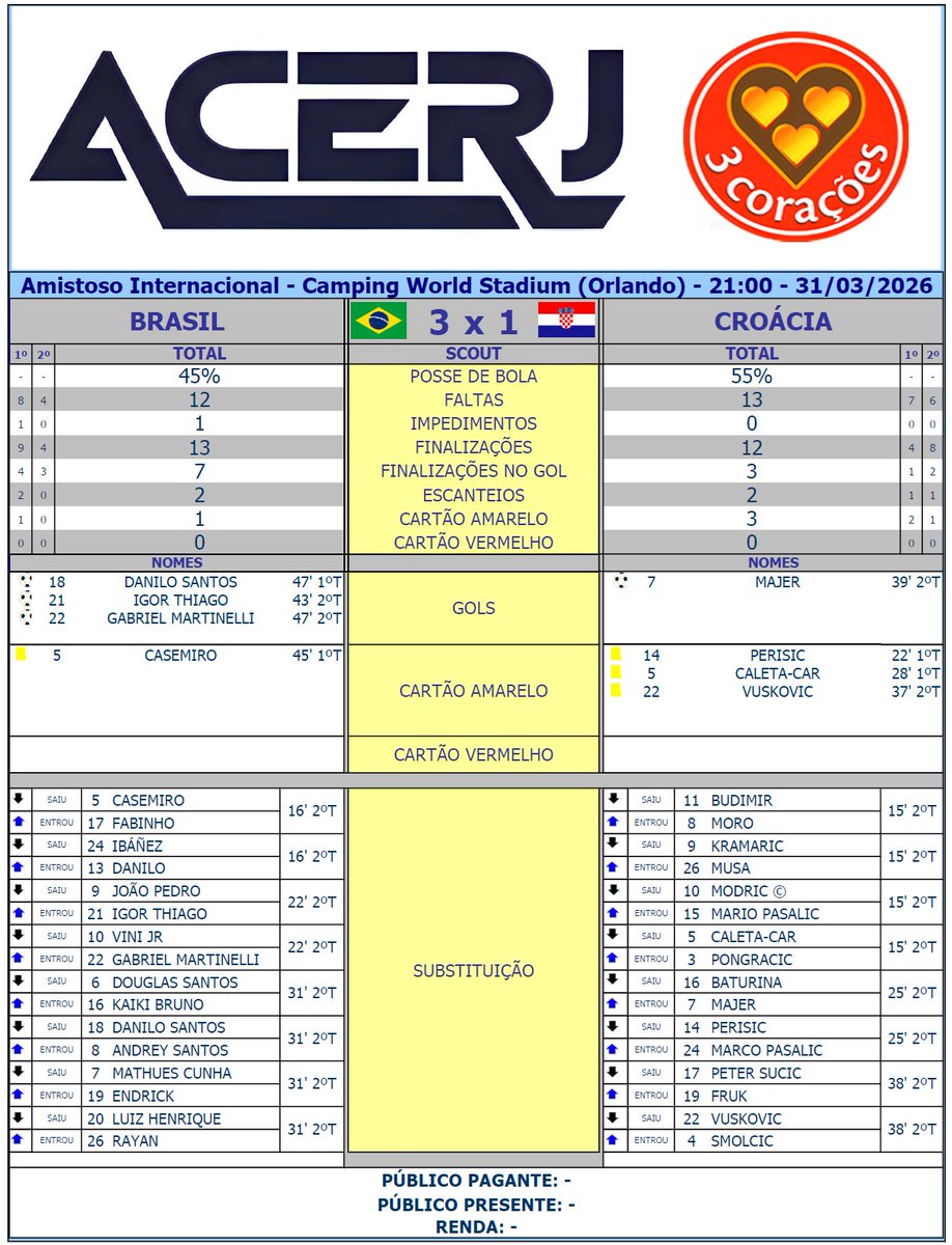 Scout Final de Brasil e Croácia em jogo amistoso de preparação para a Copa do Mundo de 2026 no Camping World Stadium em Orlando #Acerjinforma #BRAxCRO #BRACRO @CBF_Futebol @HNS_CFF