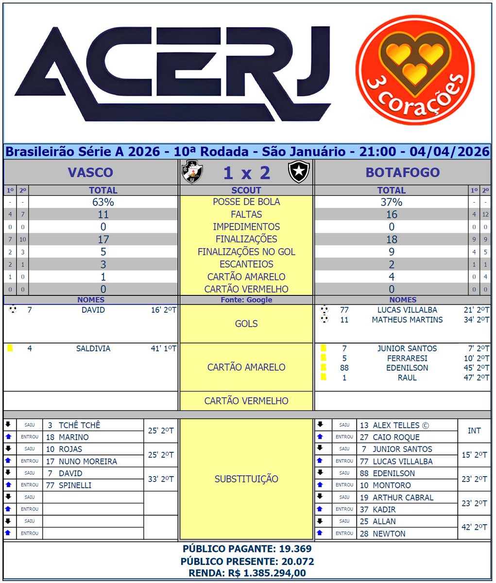 Scout Final de Vasco e Botafogo pela 10ª Rodada do Campeonato Brasileiro 2026 em São Januário (Fonte: Google) #Acerjinforma #brasileirao2026 #VASxBOT #VascodaGama #Botafogo @Brasileirao @VascodaGama @Botafogo