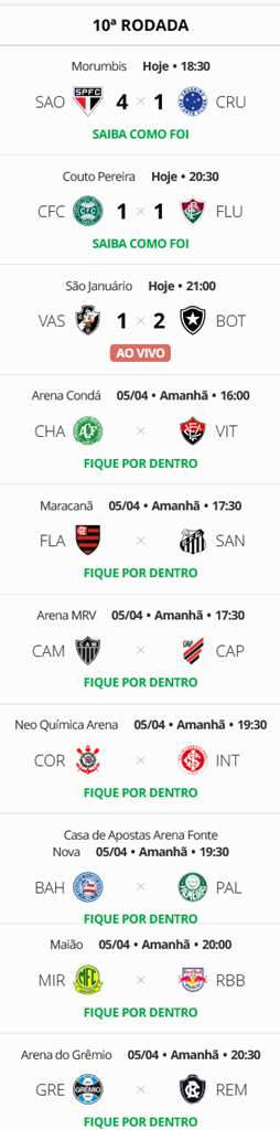 Três jogos abriram a 10ª rodada do Campeonato Brasileiro neste sábado. O Vasco, que perdeu para o Botafogo por 2 a 1, caiu para a 9ª colocação.