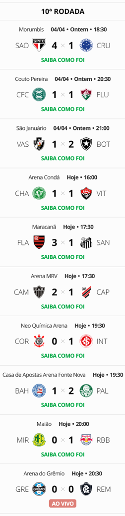 Terminada a 10ª rodada do Campeonato Brasileiro, o Vasco, que perdeu para o Botafogo por 2 a 1, está na 12ª colocação. O Gigante da Colina está a 5 pontos do G5 e a 4 pontos do Z4. Seis times têm um jogo a menos do que os demais participantes.