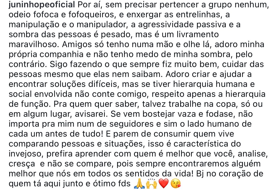 Juninho Pernambucano faz postagem em rede social: 'Por aí, sem precisar pertencer a grupo nenhum. Odeio fofoca e fofoqueiros'