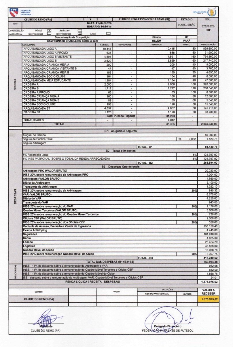 Renda e público de @ClubeDoRemo 1 x 1 @VascodaGama, no Estádio Mangueirão, pela 11a rodada da Série A do Campeonato Brasileiro.