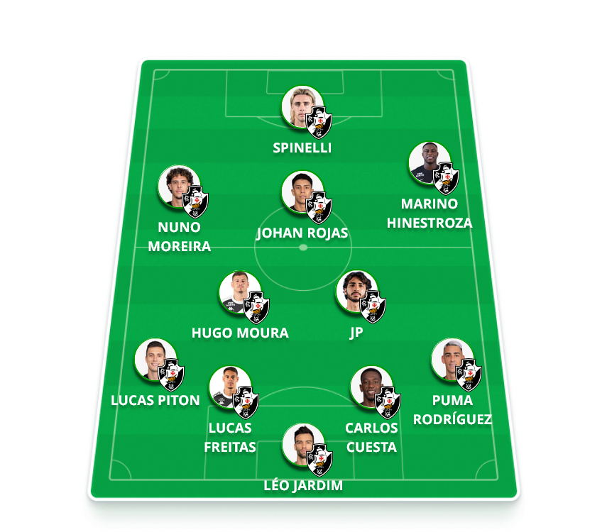 Provável escalação do Vasco Léo Jardim, Puma, Cuesta, Freitas, Piton; Hugo, JP, Rojas (França); Nuno Moreira, Marino (Adson) e Spinelli