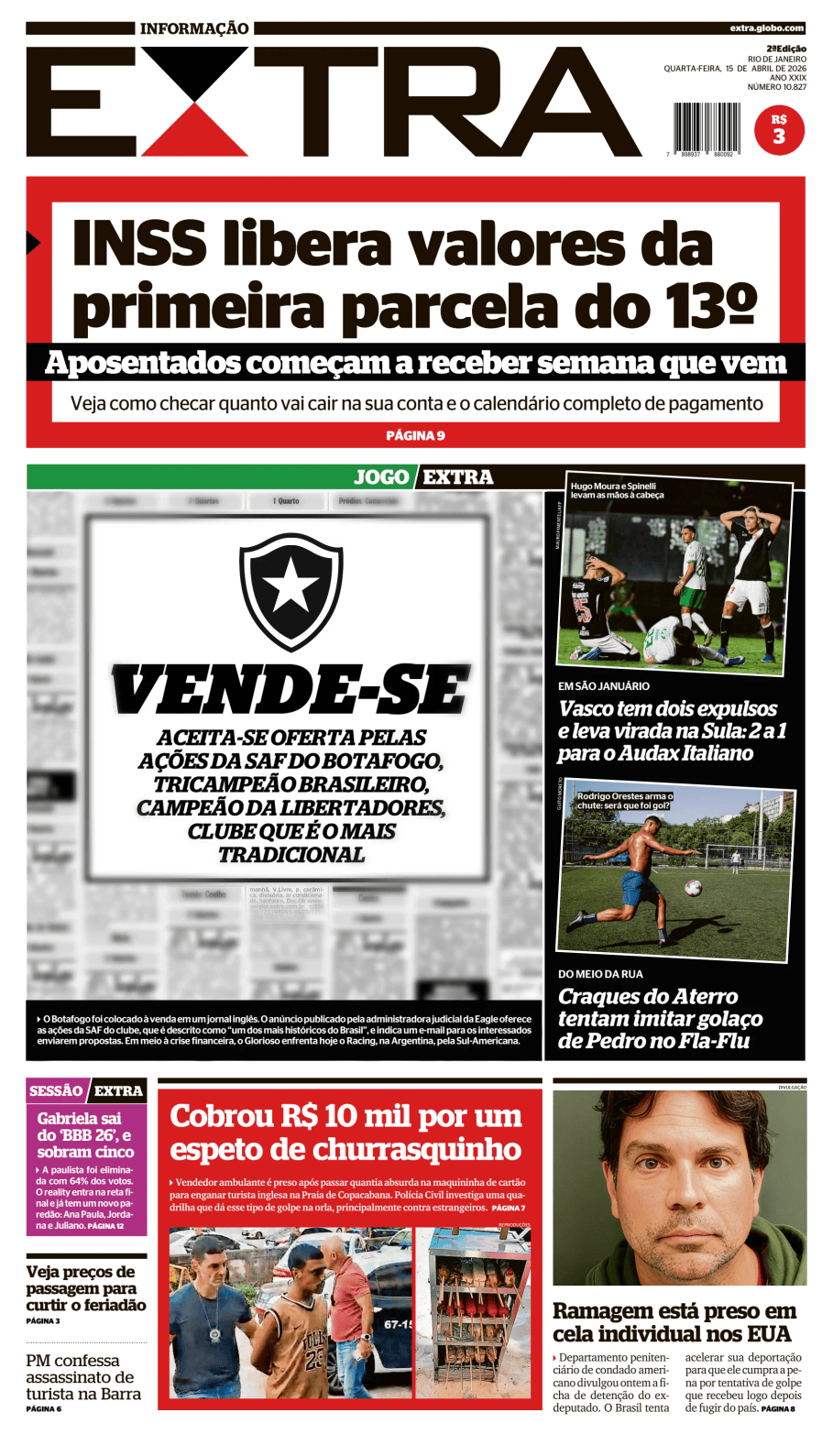 Pela Copa Sul-Americana, o Vasco, prejudicado pela arbitragem, foi derrotado pelo Audax Italiano por 2 a 1 de virada em São Januário. No basquete, o Vasco foi rebaixado no NBB. Veja as capas dos jornais.