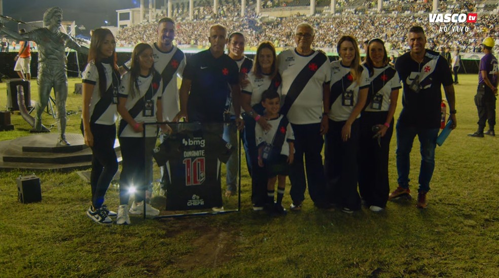 Filho de Dinamite, Rodrigo foi um dos homenageados dentro de campo. Perto da estátua de Roberto em São Januário, a família recebeu a camisa 10 de Dinamite das mãos de Felipe, diretor técnico do Vasco.