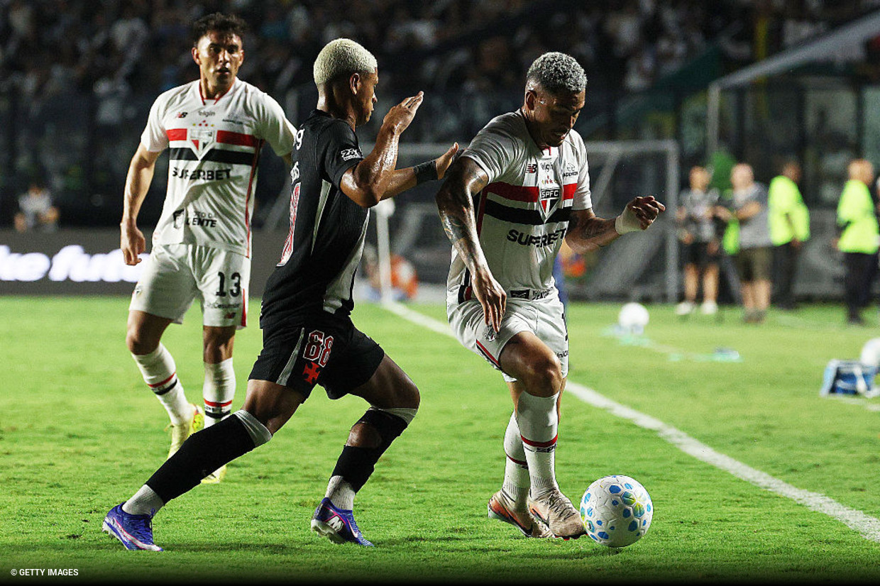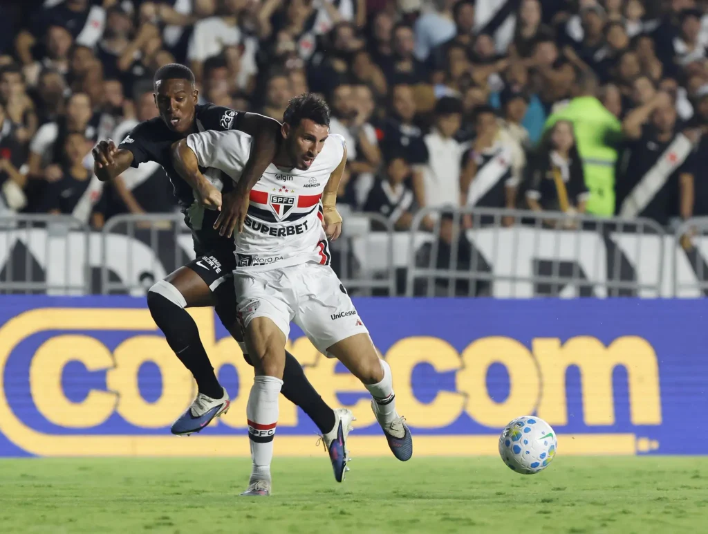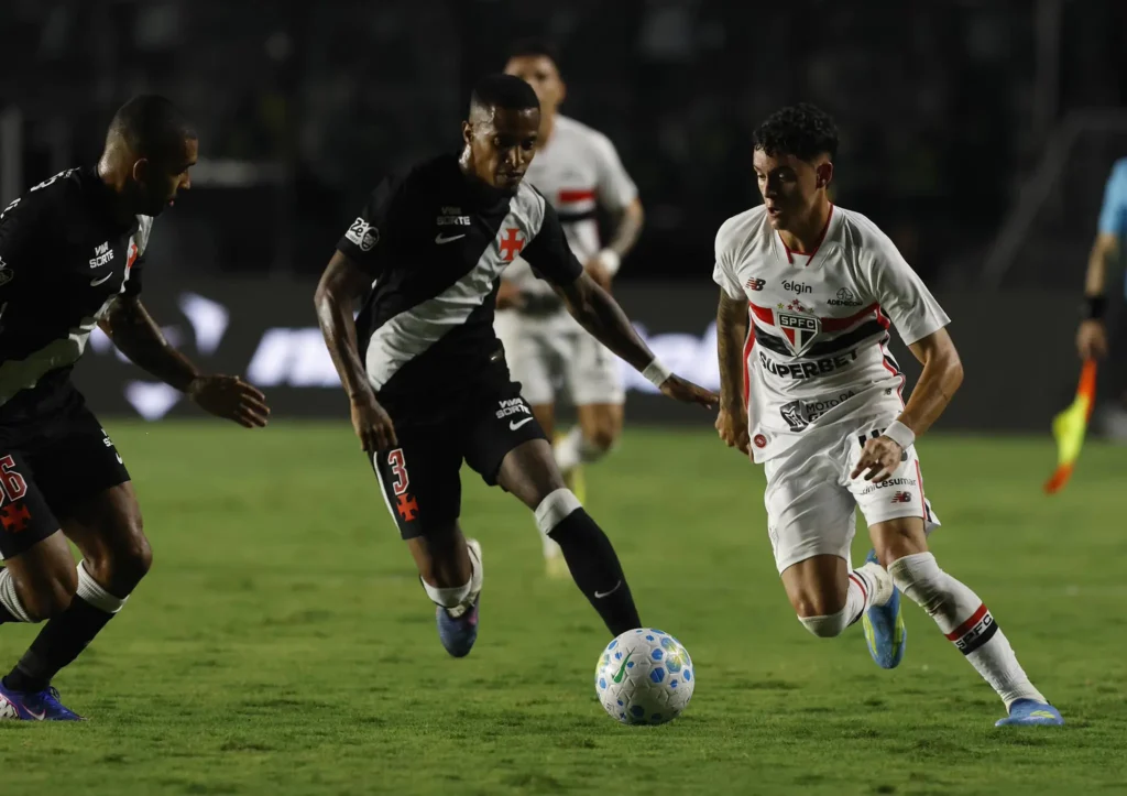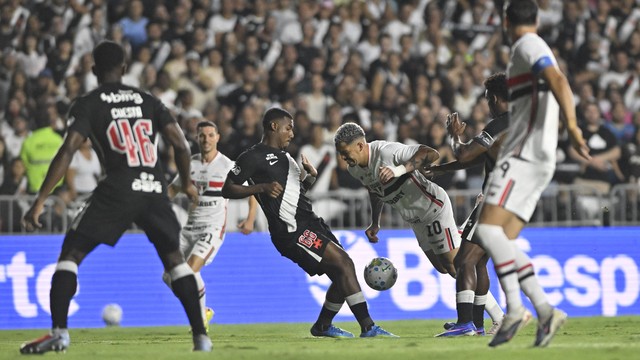 Pouco depois, Calleri perdeu chances em sequência. Lucca fez boa jogada individual, invadiu a área pelo lado esquerdo e tocou para o argentino. A bola já tinha passado por Léo Jardim, mas o atacante pegou torto na bola. No rebote, Cuiabano salvou em cima da linha. Ele ainda tentou de novo duas vezes, mas o Vasco subiu o muro.
