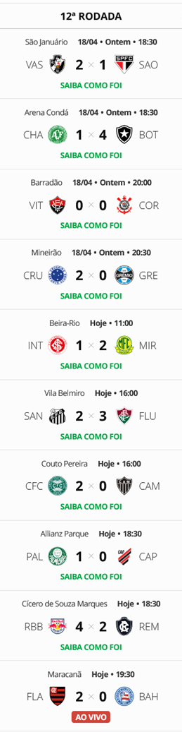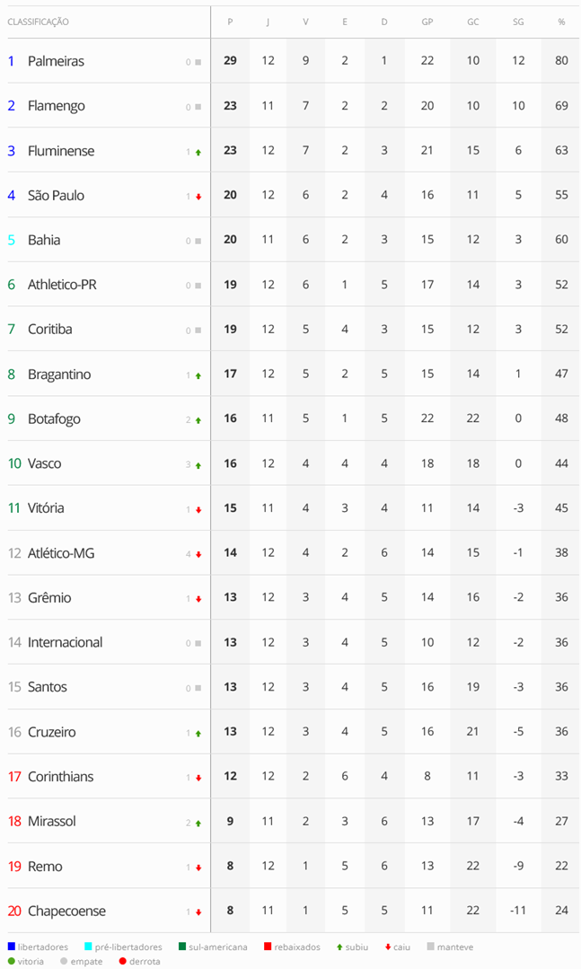 Terminada a 12ª rodada do Campeonato Brasileiro, o Vasco, que derrotou o São Paulo por 2 a 1, está na 10ª colocação. O Gigante da Colina está a 4 pontos do G5 (zona de classificação à Libertadores) e a 4 pontos do Z4 (zona do rebaixamento).