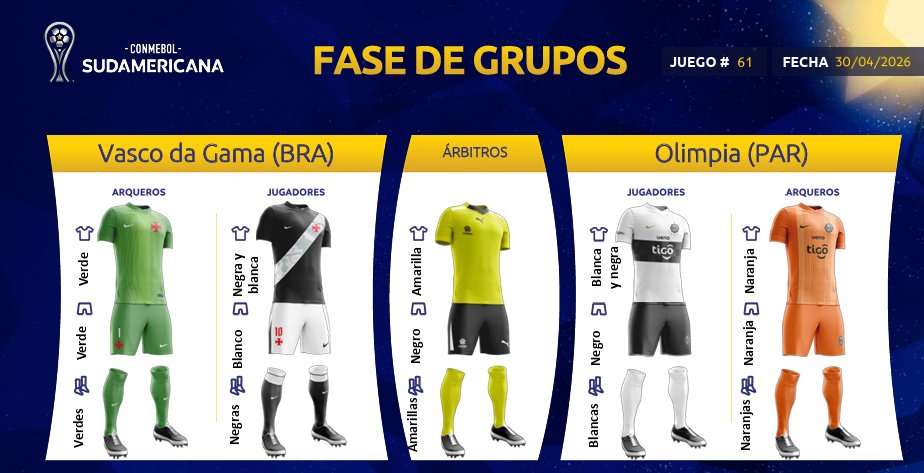 Vasco enfrentará o Olimpia de camisa preta, calção branco e meias pretas; goleiro usará verde