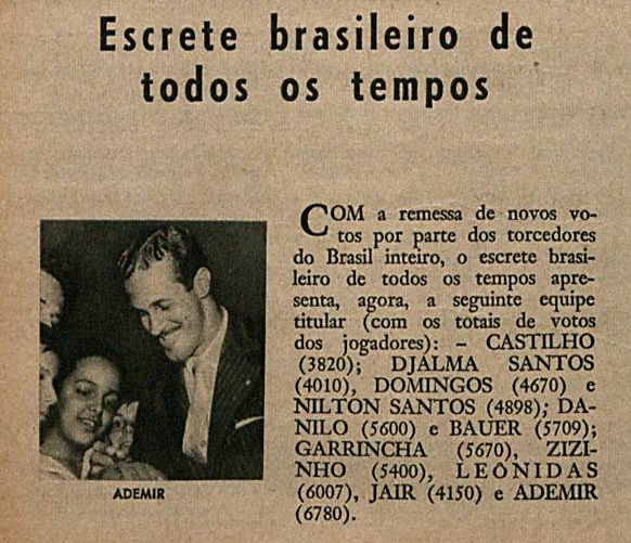 Após a Copa do Mundo de 1958, Ademir foi eleito para a Seleção de todos os tempos da Seleção Brasileira por votação popular promovida pela Manchete Esportiva.