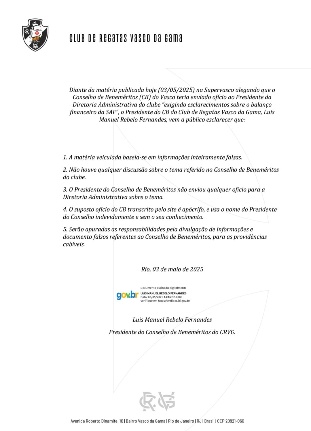 Diante da matéria publicada hoje (03/05/2025) na Supervasco alegando que o Conselho de Beneméritos (CB) do Vasco teria enviado ofício ao Presidente da Diretoria Administrativa do clube "exigindo esclarecimentos sobre o balanço financeiro da SAF", o Presidente do CB do Club de Regatas Vasco da Gama, Luis Manuel Rebelo Fernandes, vem a público esclarecer que: