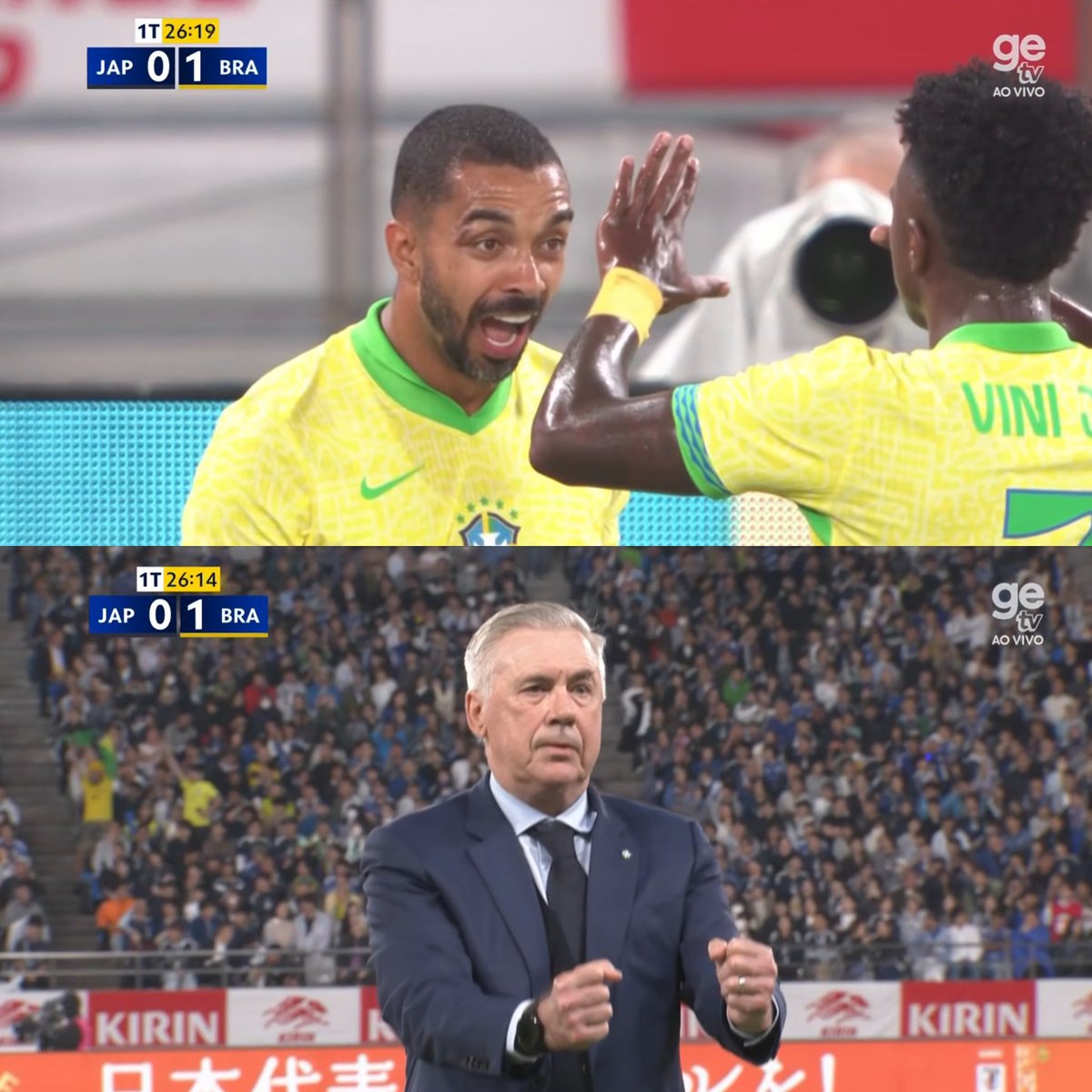 Imagem mostra comemoração de Paulo Henrique e de Carlo Ancelotti após o gol do lateral vascaíno pelo Brasil