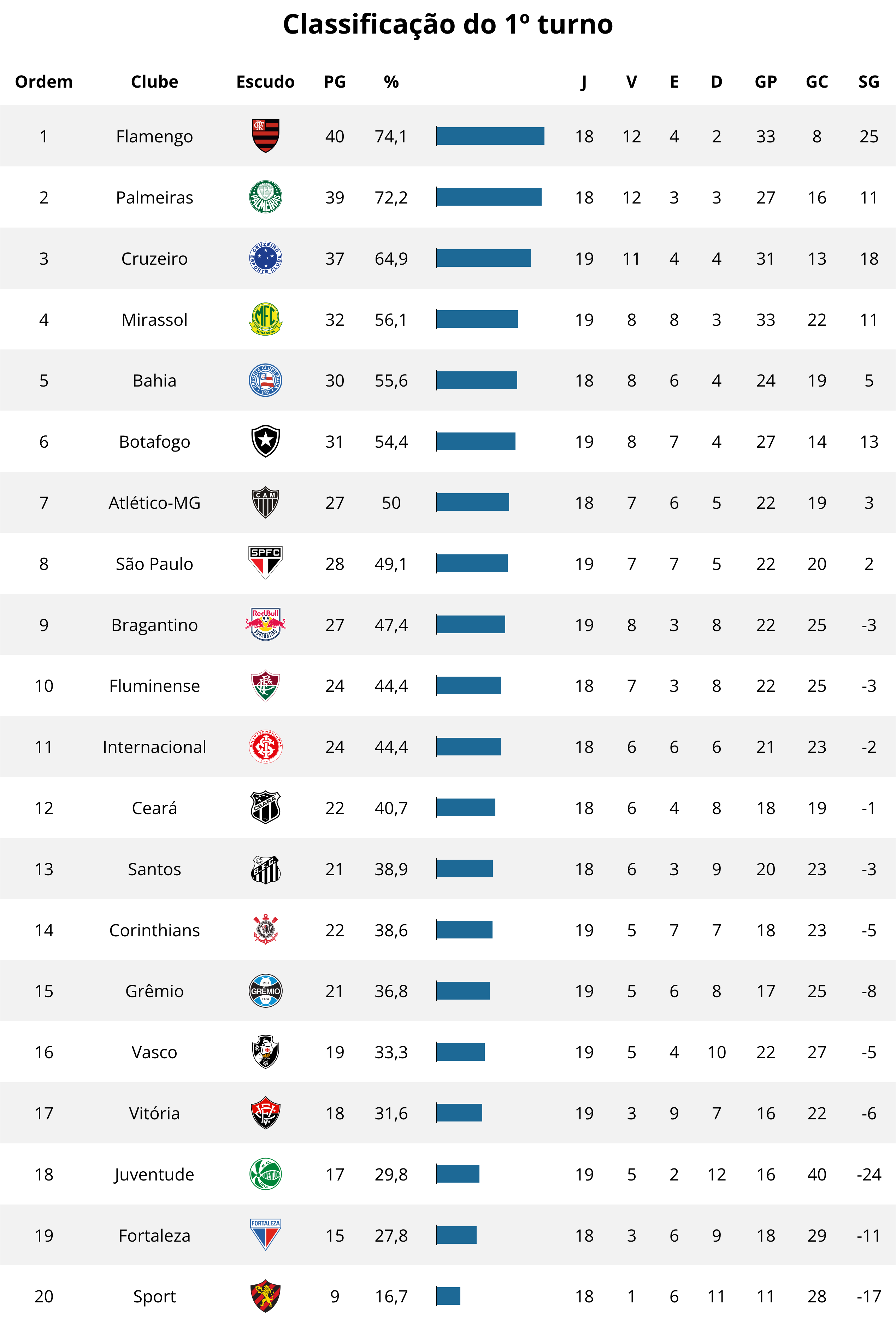 Relembre abaixo a classificação do primeiro turno do campeonato. São 10 equipes com um jogo ainda por realizar, por isso a classificação está por aproveitamento de pontos. Ainda com um jogo por disputar cada um a posição dos líderes no primeiro turno é invertida. Flamengo tem a melhor campanha, com um ponto a mais que o Palmeiras.