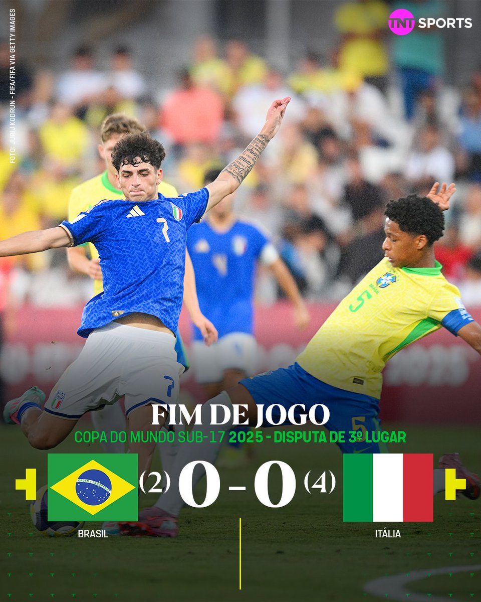 VALEU, BRASIL! 🇧🇷🥹 Mesmo após lutar com um jogador a menos desde os 12 minutos do primeiro tempo, o Brasil levou o jogo para as penalidades e foi batido pelo time italiano, ficando com o 4º lugar na Copa do Mundo sub-17. Nossa garotada brilhou demais nesse mundial! Valeu, Brasil!