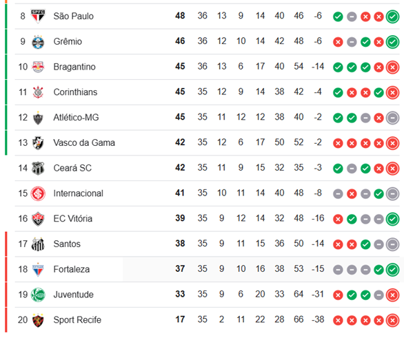 Vasco segue na 13ª colocação no Brasileiro após jogo desta 5ª-feira da 36ª rodada